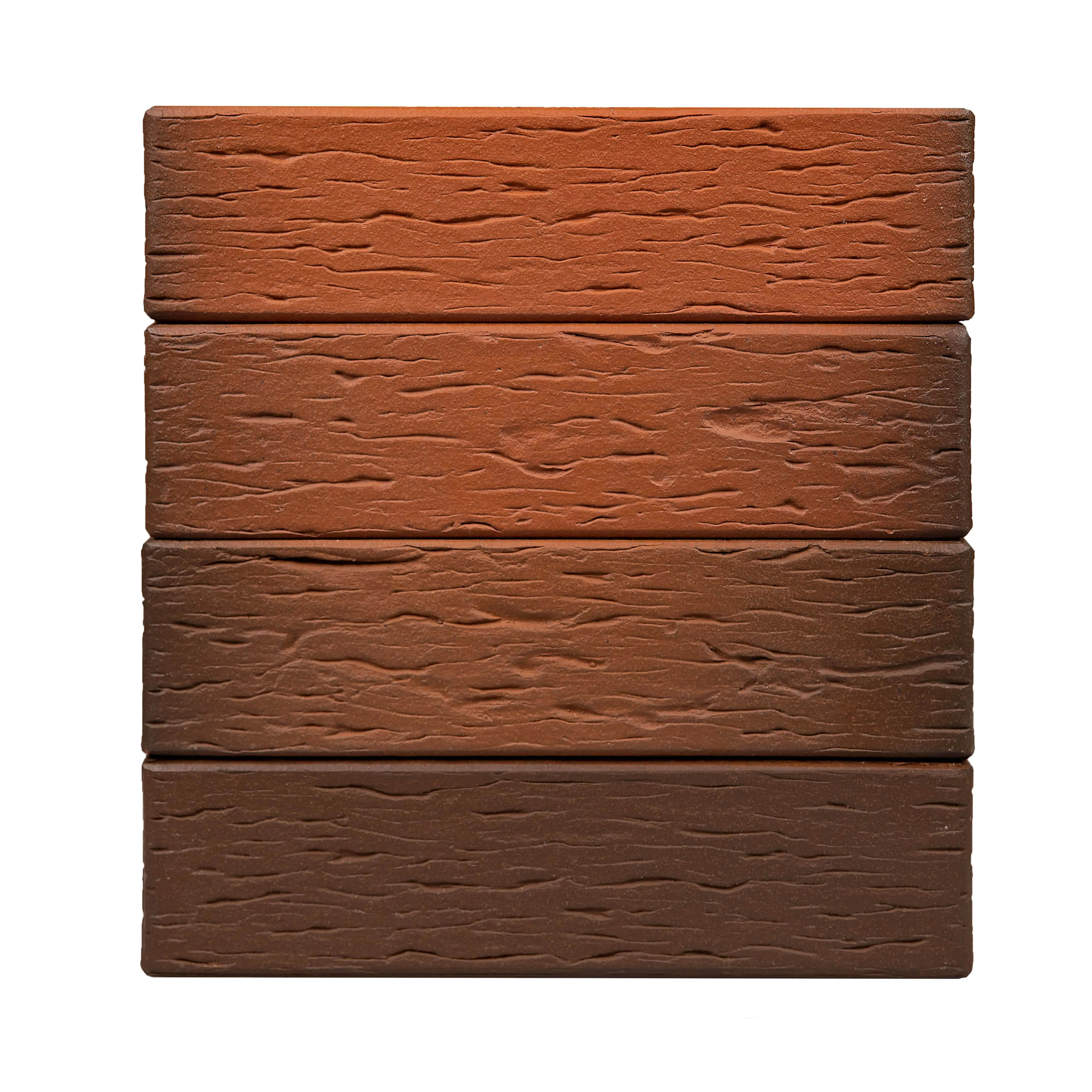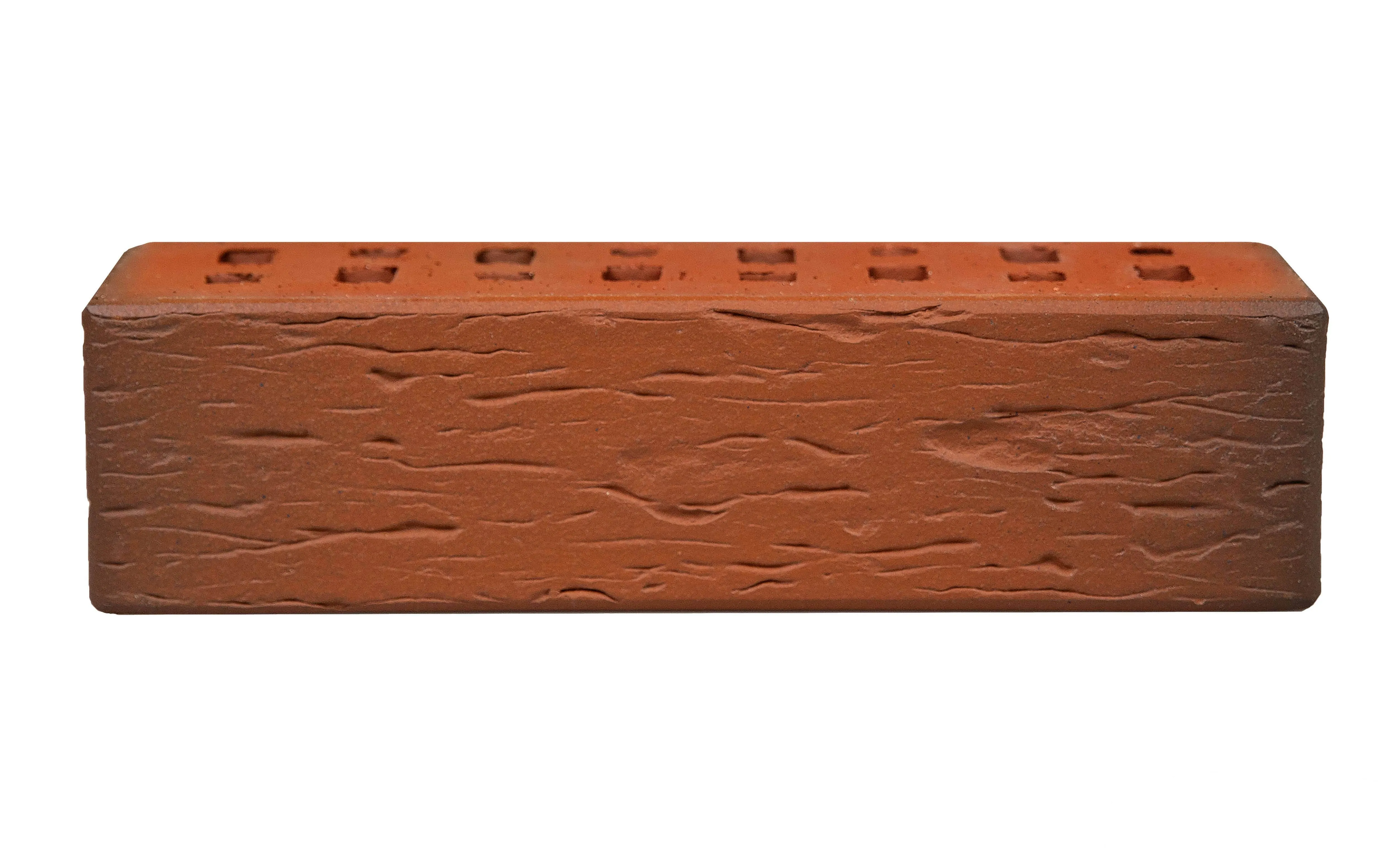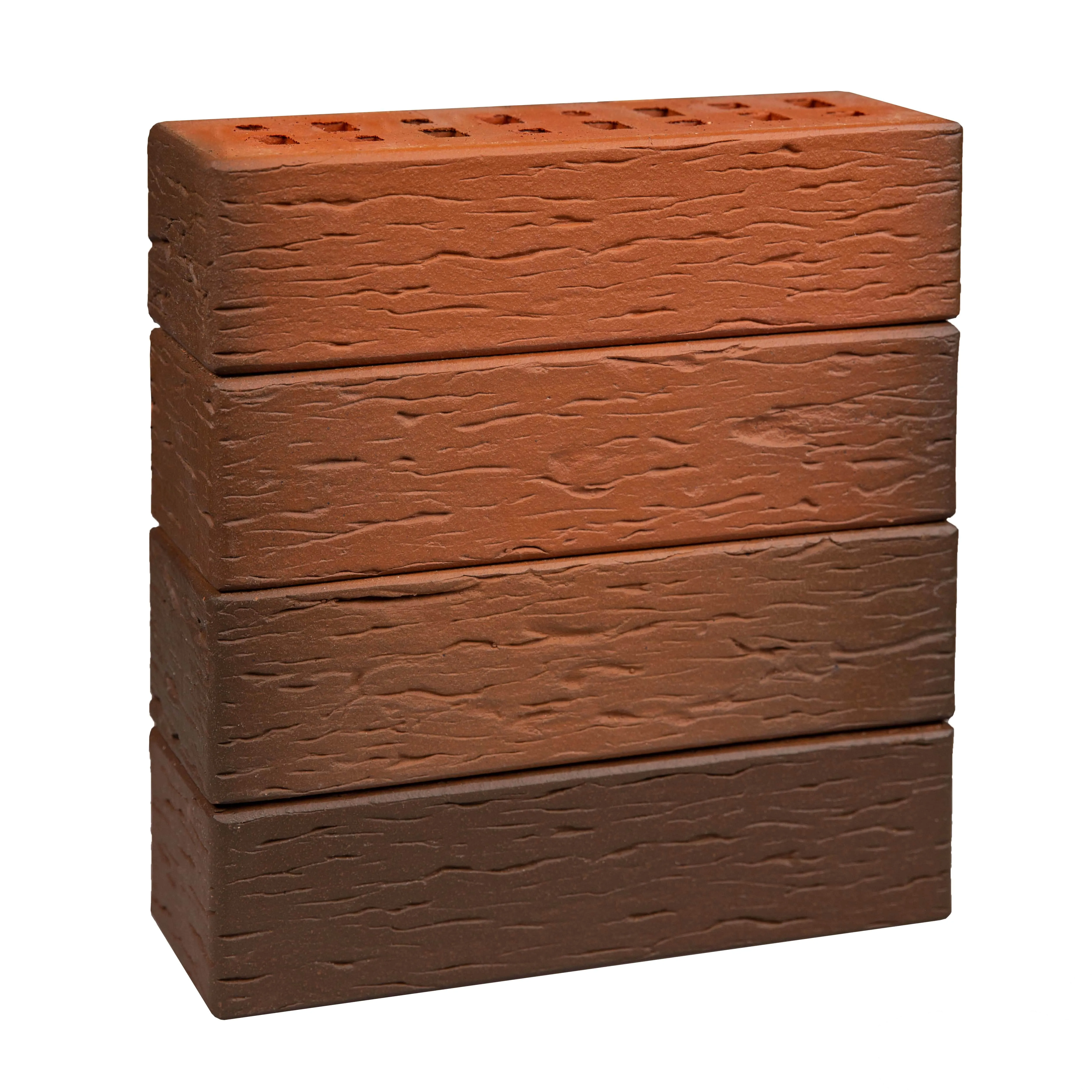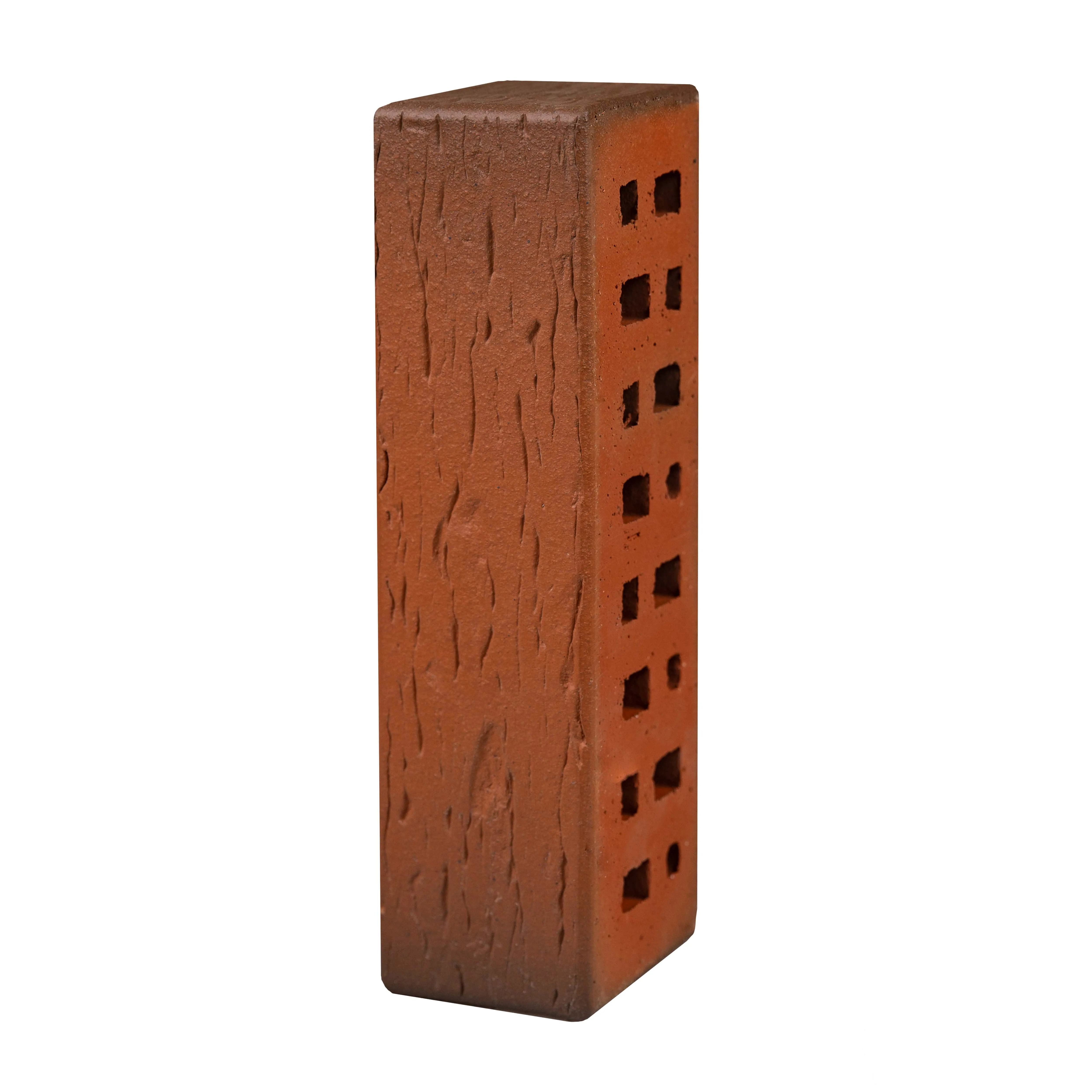 Облицовочный клинкерный кирпич с уникальным красно-коричневым оттенком и текстурой «береста», создающей эффект естественного старения. Флешинговая технология придает кладке игру цветов, делая фасад выразительным и живым.