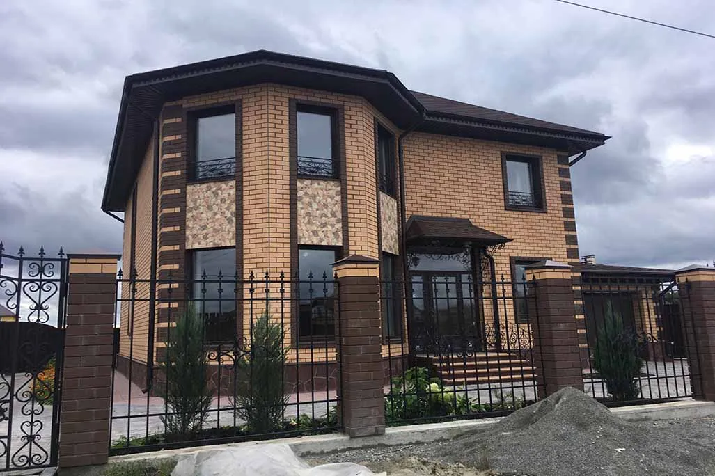 Для строительства данного дома наша компания доставила точно в срок облицовочный утолщённый кирпич цвета Солома, а для забора - кирпич завода Ликолор 1,4 НФ Шоколад.
